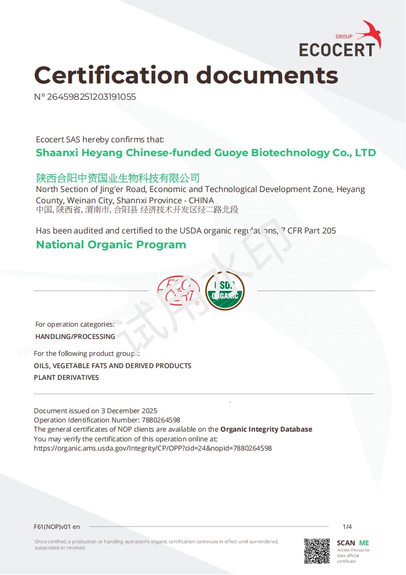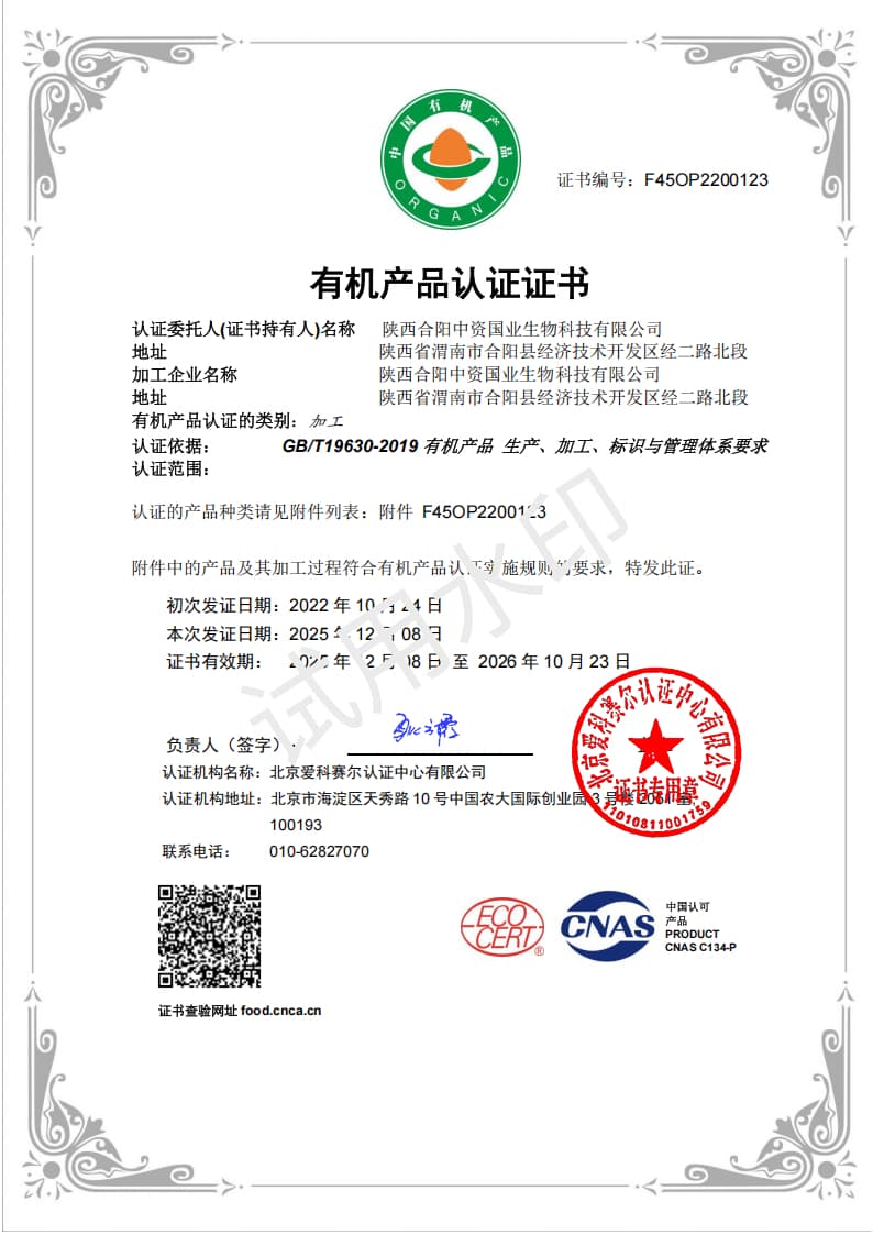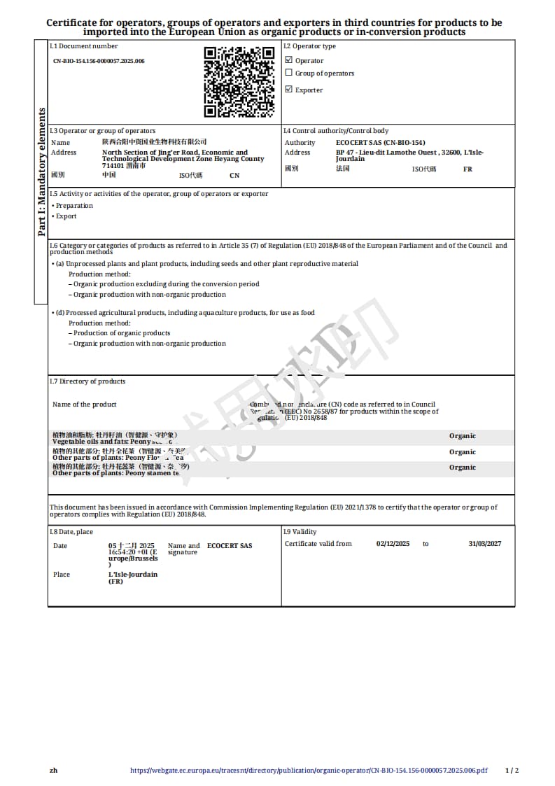 作為牡丹產(chǎn)業(yè)價值的創(chuàng)新者與推動者、牡丹產(chǎn)業(yè)的標(biāo)桿企業(yè)、牡丹產(chǎn)業(yè)分會的副會長單位、《牡丹籽油》國家標(biāo)準(zhǔn)的參與制訂單位,中資國業(yè)從2012年起持續(xù)深耕牡丹領(lǐng)域,公司在陜西合陽擁有21760畝自有油用牡丹種植基地,并連續(xù)多年通過中歐美三方有機認證,從源頭確保了牡丹籽油的品質(zhì),保證每一滴植物Omega-3入口都是天然無污染的。
